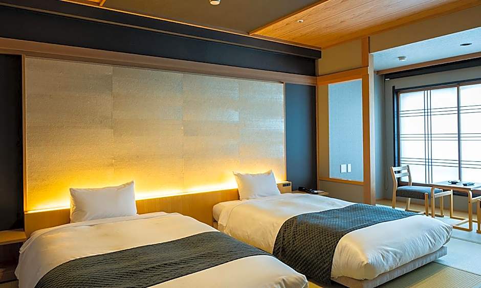 The twin room includes a private bathroom, well-fitted with a bath, a shower, a bidet, a hairdryer and slippers. The twin room features tatami floors, a seating area with a flat-screen TV with satellite channels, air conditioning, a safe deposit box, as well as an electric kettle. The unit offers 2 beds.